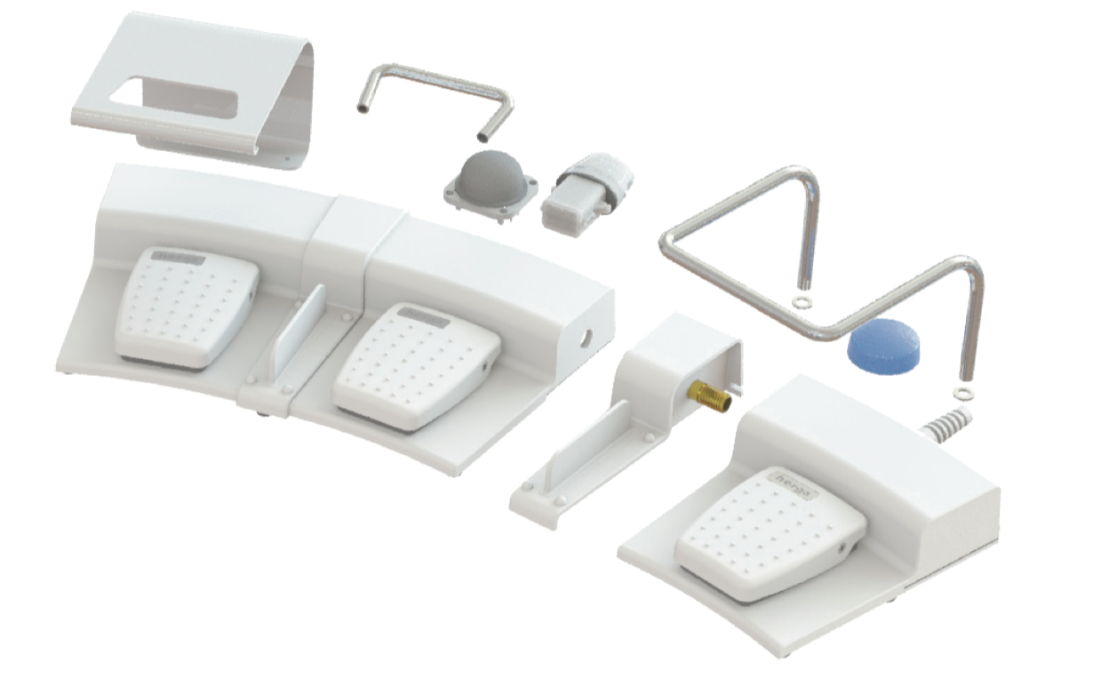Ce bouton à activer au pied est facilement intégrable sur n’importe quel plan de travail. Il est aussi possible de le monter sur notre système de pédale modulaire, ajoutant ainsi une fonction supplémentaire.